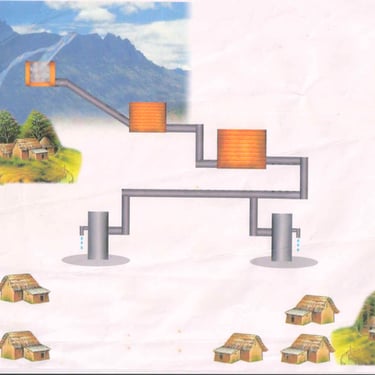 Using a gravity-based pipeline system, water flows naturally from the collection tank over a distance of 2–3 kilometres through rugged terrain to reach the villages — without the need for electricity or pumps.Filtration & Distribution: